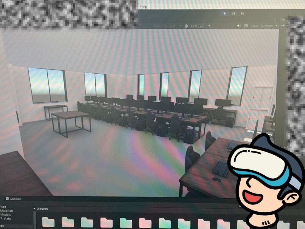 実際の事業所内を細かく採寸し、BlenderやUnityを活用してVR空間として再現しました